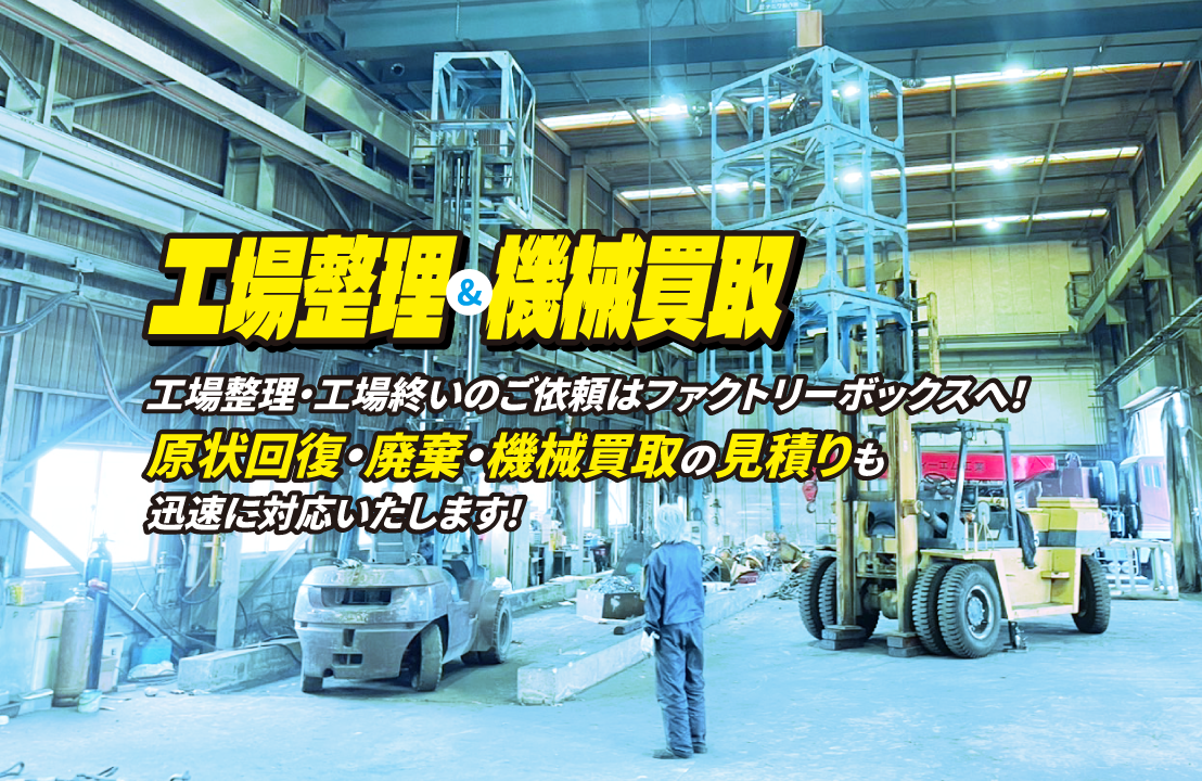 私たちは貿易や国内販売ルートにて高価買取を実現いたします。搬出もおまかせください。放置された大型機械や小さな工具類まで買取させていただきますので費用負担なく工場をお片付けできます。
